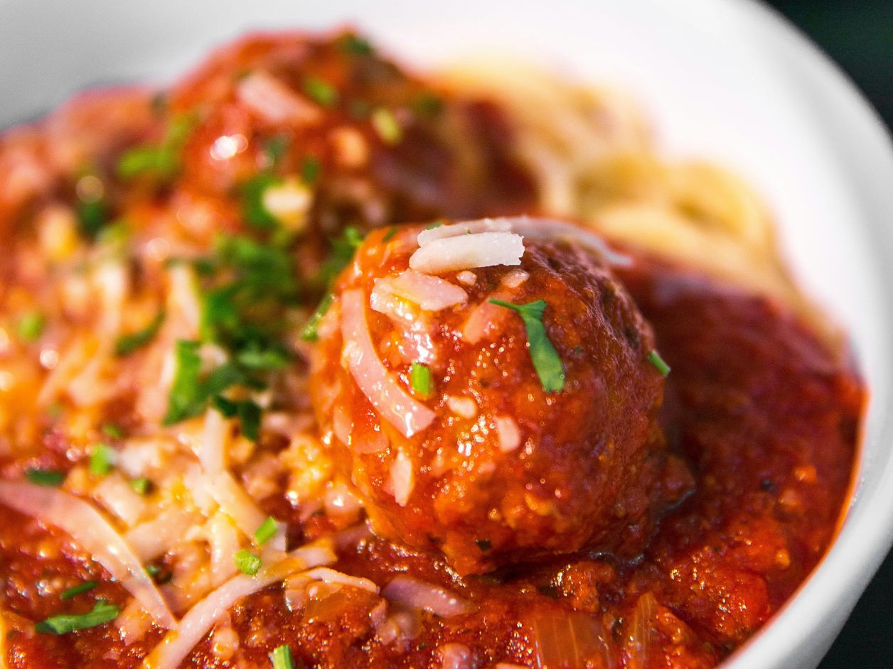 Ciabatta bread with fresh tomato sauce, minced beef meatballs topped with melted cheddar cheese and basil.